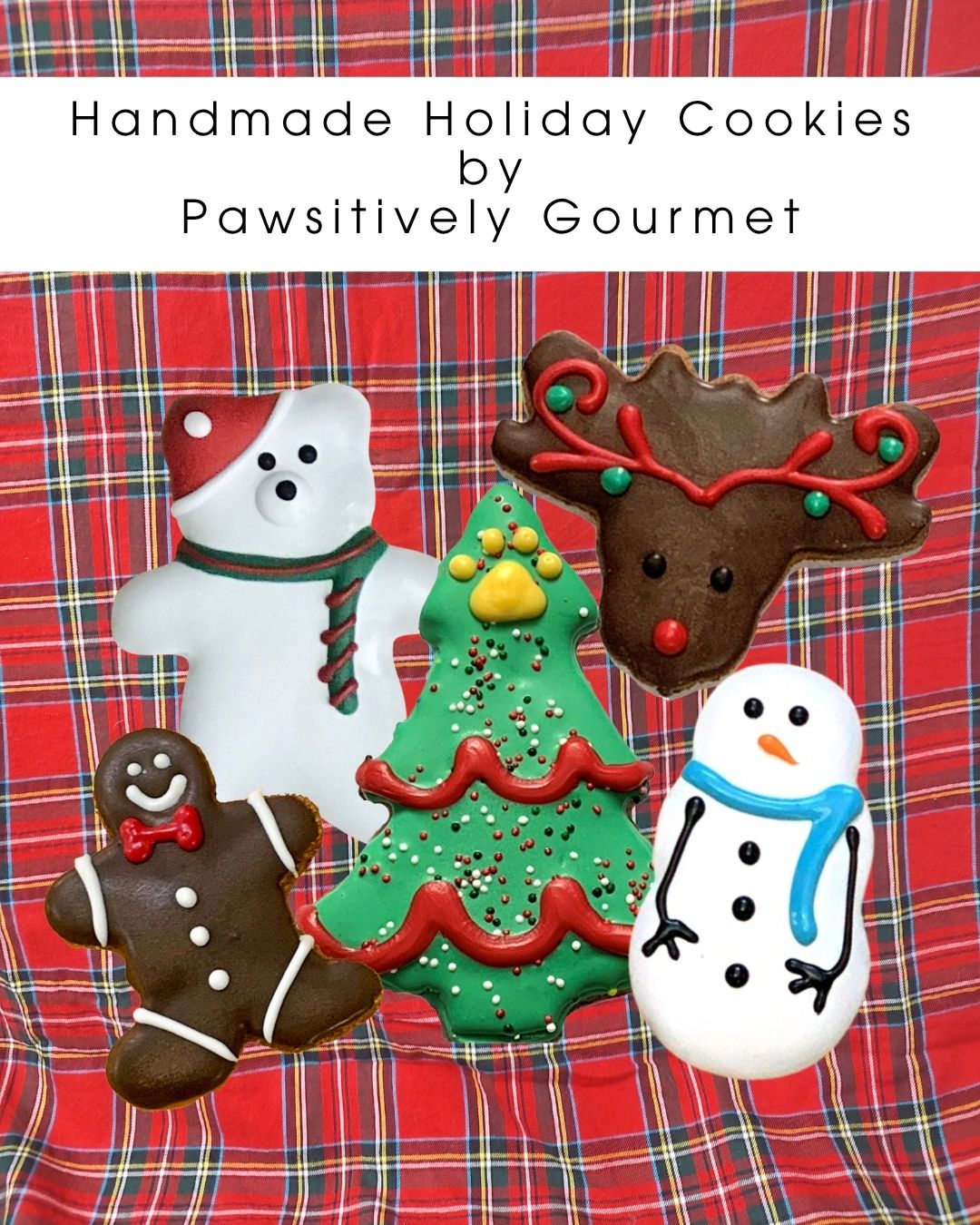 This charming assortment of handmade dog cookies brings festive cheer to the season with adorable designs crafted to look like classic holiday characters. Featuring gingerbread figures, a jolly snowman, a decorated tree, and a playful reindeer, each cookie is beautifully iced and made with canine-friendly ingredients. A delightful, photo-ready treat that adds a sweet holiday touch to any pup’s celebration.