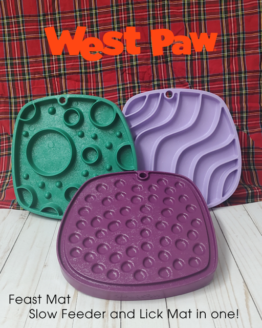 This colorful trio of West Paw Feast Mats brings a fun, enriching twist to mealtime with designs that combine slow-feeding and lick-mat benefits in one durable piece. Featuring playful textures and soothing pastel tones, each mat encourages calmer eating, mental stimulation, and longer-lasting enjoyment for dogs of all sizes. A practical and engaging gift idea for pups who love interactive feeding.